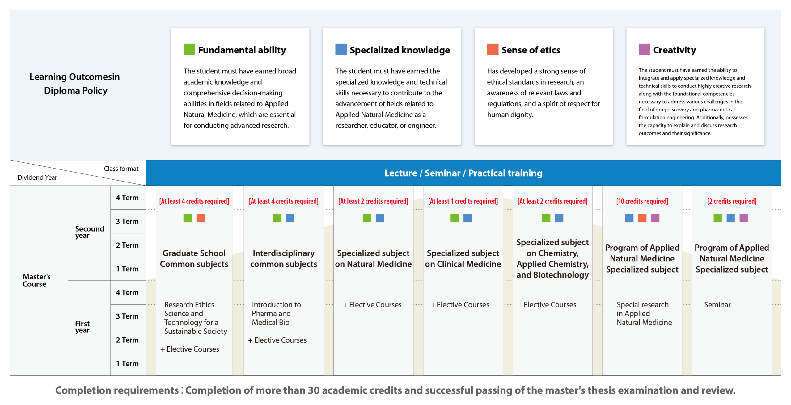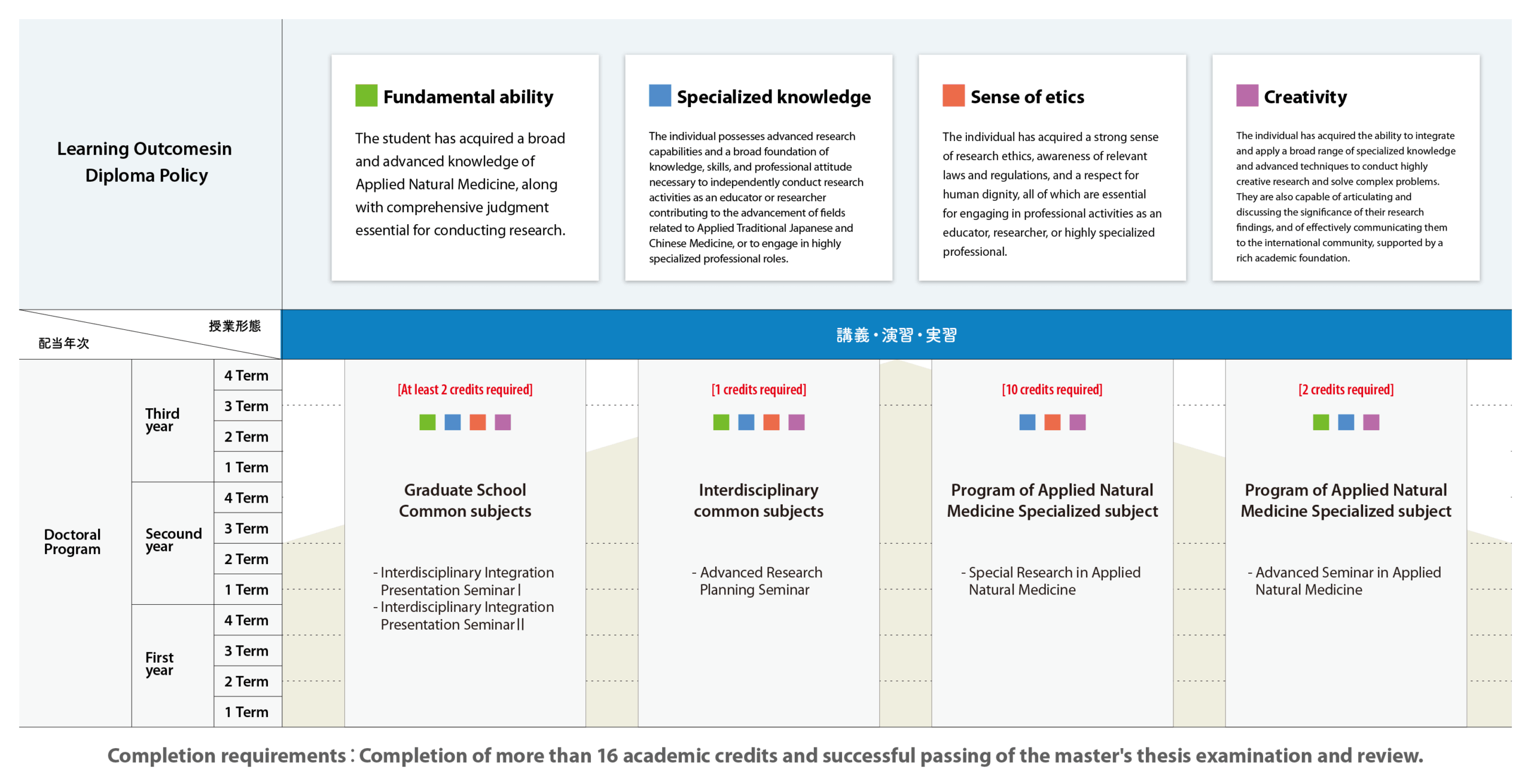 Contribution through the cultivation of human resources who can advance drug discovery and pathological analysis using traditional Japanese and Chinese medicine, based on an integrated education in pharmaceutical and engineering sciences, thereby promoting both human and environmental health and the progress of academic research. The Program of Applied Natural Medicine fosters a comprehensive perspective, practical skills, and applied capabilities through a distinctive and specialized curriculum that integrates pharmaceutical and engineering sciences. This program promotes the creation of novel pharmaceuticals using traditional herbal medicine, the development of drug discovery resources, regulatory science for plant-based medicines, and pathological analysis encompassing molecular to organ-level interactions, as well as the scientific elucidation of pre-disease states. It aims to nurture a diverse range of professionals, including researchers, educators, engineers, and regulatory officers, who can advance next-generation healthcare. Research Theme Research Theme Pickup Recent Research Topics Successful Rapid Induction of Plant Steroid Accumulation Using a Single Regulatory Factor – A Novel Approach to “Plant Bio-Manufacturing. Mechanistic Elucidation of D-Amino Acid Incorporation into Functional Lasso Peptides Development of a Novel Therapeutic Strategy Effective Against Immune-Resistant Tumors – Enhancing Immune Recognition of Cancer Cells Through Pharmacological Modulation Discovery of a Novel Pancreatic Cancer Therapeutic Agent Derived from Medicinal Plants Targeting the Tumor Microenvironment Molecular Mechanism of Diosgenin in Restoring Memory Function by Regenerating Atrophied Axons in the Brains of Alzheimer’s Disease Model Mice Recent Research Topics Successful Rapid Induction of Plant Steroid Accumulation Using a Single Regulatory Factor – A Novel Approach to “Plant Bio-Manufacturing. Mechanistic Elucidation of D-Amino Acid Incorporation into Functional Lasso Peptides Development of a Novel Therapeutic Strategy Effective Against Immune-Resistant Tumors – Enhancing Immune Recognition of Cancer Cells Through Pharmacological Modulation Discovery of a Novel Pancreatic Cancer Therapeutic Agent Derived from Medicinal Plants Targeting the Tumor Microenvironment Molecular Mechanism of Diosgenin in Restoring Memory Function by Regenerating Atrophied Axons in the Brains of Alzheimer’s Disease Model Mice Master’s Course Doctoral Course Educational Goals・Educational Objectives・Three Policies Educational Objectives Our educational objective is to develop human resources who can contribute to realizing a “sustainable society” by reading sustainability studies from an international perspective and acquiring problem-solving skills, primarily for “global-scale” issues, through a cross-disciplinary approach that integrates natural and social sciences. Educational Goals This program aims to cultivate professionals equipped with advanced knowledge and technical expertise in applied traditional Japanese and Chinese medicine, grounded in a broad interdisciplinary foundation. It seeks to develop researchers, educators, engineers, and regulatory officers in pharmaceutical sciences who can contribute to drug development and regulation based on traditional medicine research, as well as to the creation of new healthcare approaches grounded in pre-disease studies. Through this, the program fosters human resources who can advance drug discovery from traditional medicine, including Kampo, and promote public health and the progress of academic research. Diploma Policy Policy on Completion Certification and Degree Conferment In the master’s course of the Program of Applied Natural Medicine, there is a societal expectation to cultivate professionals in line with the educational and research objectives. To fulfill this goal, students are generally required to be enrolled for at least two years, complete the prescribed curriculum, earn the necessary credits, and receive research guidance. Upon passing the evaluation of their master’s thesis and the final examination, students who have acquired foundational competencies, specialized academic knowledge, ethical awareness, and creativity will be awarded the degree of Master of Pharmaceutical Sciences. Achievement Goals and Performance Indicators Fundamental ability Learning Outcomes: The student must have earned broad academic knowledge and comprehensive decision-making abilities in fields related to Applied Natural Medicine, which are essential for conducting advanced research. Achievement Standards: The student must have earned the required credits for completion of lecture-based coursework. Specialized knowledge Learning Outcomes: The student must have earned the specialized knowledge and technical skills necessary to contribute to the advancement of fields related to Applied Natural Medicine as a researcher, educator, or engineer. Achievement Standards: The student must have earned the required credits for completion of exercises and the Special Research in Applied Natural Medicine in order to fulfill the completion requirements. Sense of ethics Learning Outcomes: Has developed a strong sense of ethical standards in research, an awareness of relevant laws and regulations, and a spirit of respect for human dignity. Achievement Standards: Has completed the designated education in research ethics. Creativity Learning Outcomes: The student must have earned the ability to integrate and apply specialized knowledge and technical skills to conduct highly creative research, along with the foundational competencies necessary to address various challenges in the field of drug discovery and pharmaceutical formulation engineering. Additionally, possesses the capacity to explain and discuss research outcomes and their significance. Achievement Standards: The candidate has fulfilled the requirements for the master’s degree by successfully p